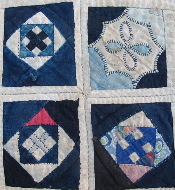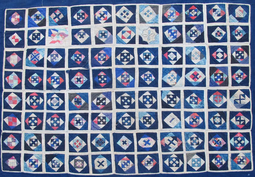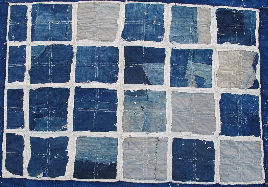 Antique appliqué Zhuang Minority Dowry Quilt top of 20 8” squares divided in fourths each quarter with a central diamond with a cross or X and a single row of four 4”x 8” oblongs without the X’s on one side ; two unique squares: a floral couched design and an appliqué flower; handwoven indigo and natural cotton and commercial cotton including prints; all hand-stitched; shows wear and use; from Nandan County, Guangxi Province c 1930 -1940s; 74” x 62” with handwoven indigo cotton frame; p 109-110 Quilts of Southwest China by Marsha MacDowell and Lijun Zhang |