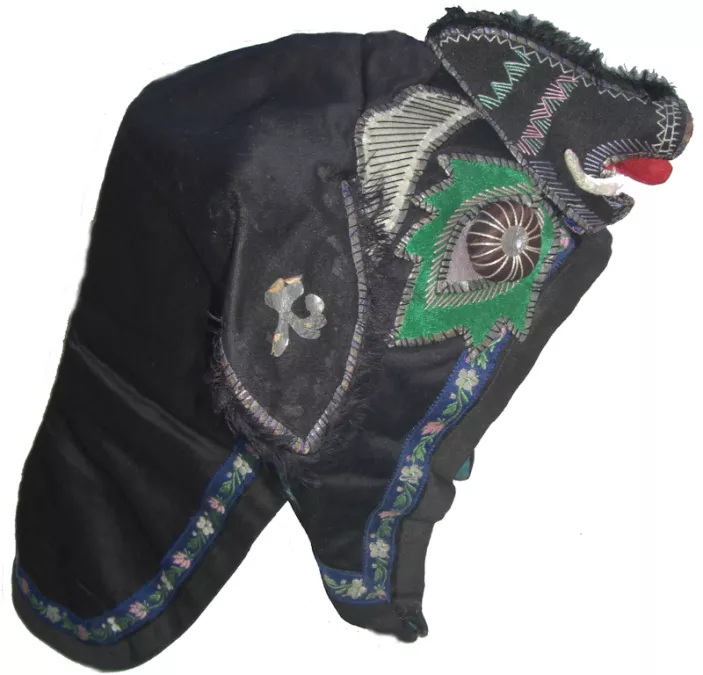 Black Silk Elephant with embroidered nose and silver couched applique; cotton lining.