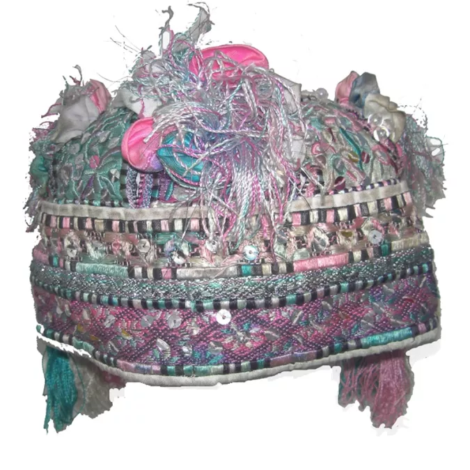 Miao Minority hat; intricate silk embroidery and woven band with plastic sequins and beads on eye-of-god tassels. Unavailable.