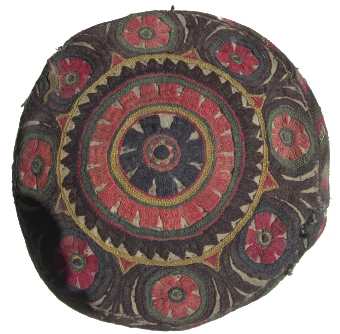 Traditional Tajik Woman’s Hat from Pamir Mountains. Front center piece which shows even when wearing a covering veil or cloth is an extremely finely executed needle point of traditional designs with a dark marron background; other sections of the hat are more loosely embroidered lively circular designs with floral centers; the lining which is tough but shows use is machine quilted cotton;