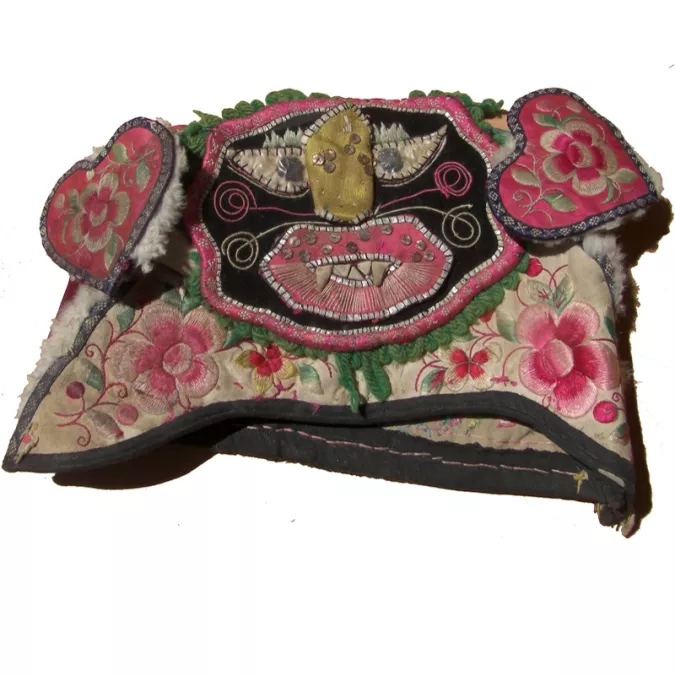 Bai Black-faced Tiger Hat; Silk floral embroidery on cotton front and velvet back; fur trim; white sections somewhat soiled;