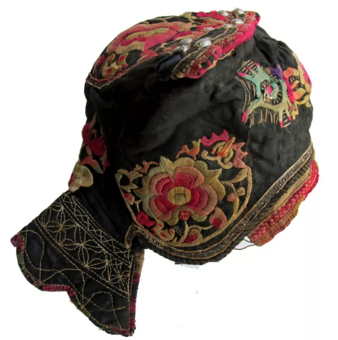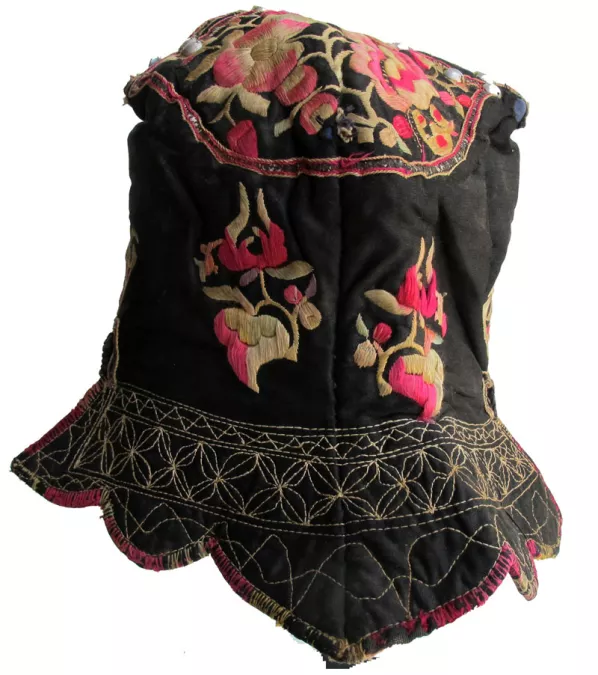 Bai Minority Girls Festival Hat with Silk Embroidered Flowers; Well-executed Buddha hand flowers peonies, and lotus with little birds and butterflies embroidered directly on to the black cotton base; lovely details of needle woven edges, and old couched old metal border; cross-stitched sweat guard on the front; all hand work except for the machine quilting on the bottom back; red and blue cotton lining has soiling from use;