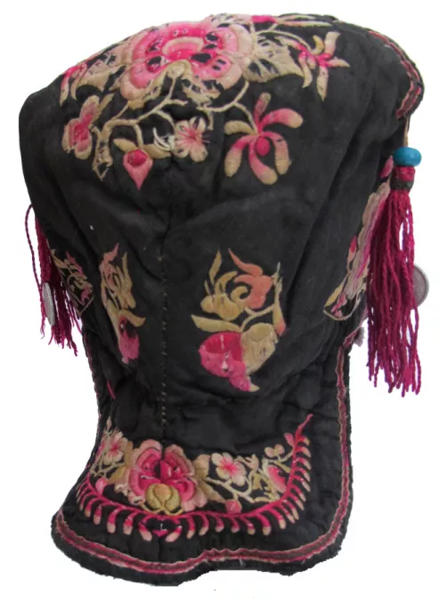 Finely Embroidered Bai Minority Festival Hat; A profusion of flowers are embroidered directly on a black cotton base; seven rather crude metal Immortals are on the front; red silk tassels one with old glass bead and two coins possibly added later; lined with red wool; Dali area of Yunnan Province; mid-20th century; embroidery is worn so that the underlying paper cut designs show; 22” circumference;