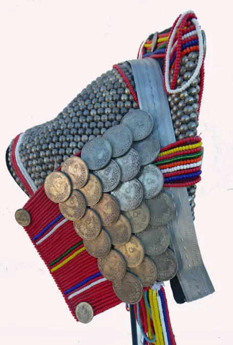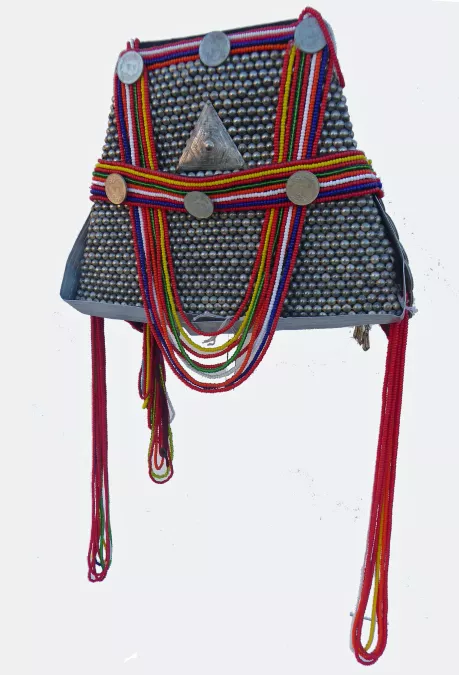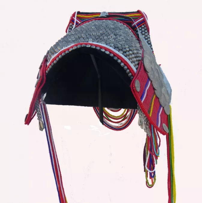 The headdress is covered with lines of small metal half circles on front and triangle back; sides of primarily red glass beads; with Thai and Burmese coins added; front edge is black velvet; long loops of glass beads from the top and bottom of the hat; other metal strips with embossed designs.