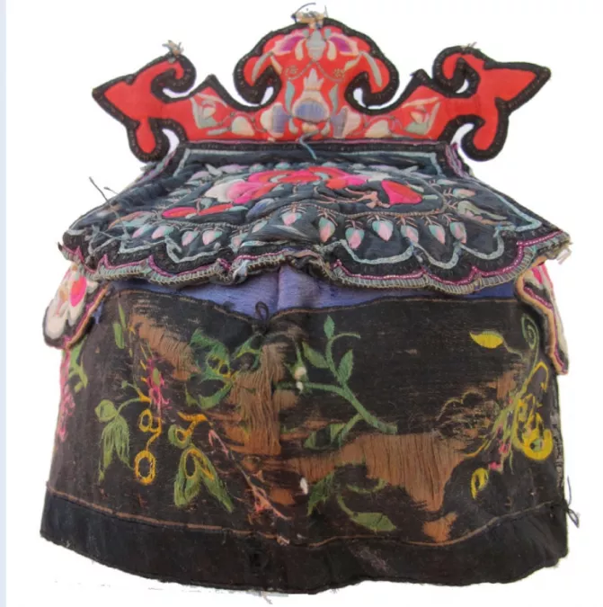 Antique Bai Minority Temple-Shaped Festival Hat; Lovely satin-stich silk embroidery with fine details of a crane, mouse, butterflies, deer, peaches, bat, and large lotus on upper crown; bottom has a worn woven ribbon which black silk is shattering due to age; polished cotton lining is fading; c 1900; collected by the late Peter Nelson in the Dali area of Yunnan Province in 1989; 21” circumference.