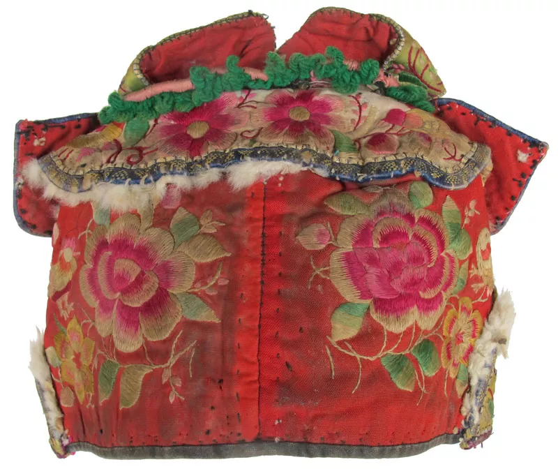 Bai Minority Petal Hat covering Tiger Face; Very unusual Bai tiger hat with 7 appliqué petals of faded pink, red, and green satin with silver couched outlines; hat fully embroidered with flowers and two birds; underneath the petals is a black velvet tiger’s face with teeth and eyes and the flower center for a nose; edges with attached white fur (rabbit?); hat is soiled; c 1950; collected by the late Peter Nelson in the daily area of Yunnan Province in 1989; 20.5” circumference.