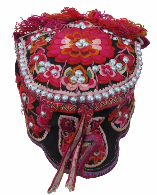 Flower Belt Yi Minority Girls Hat; Good silk embroidery on black cotton; needle-weaving and tiny cross-stitched edging; excellent condition with slight soiling from use on the white cotton lining; from Flower Belt of the Yi Ethnic Minority in Shiping County, Yunnan Province; c 1980; 24” circumference.