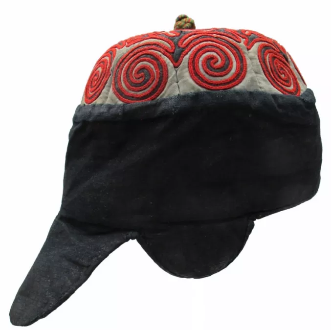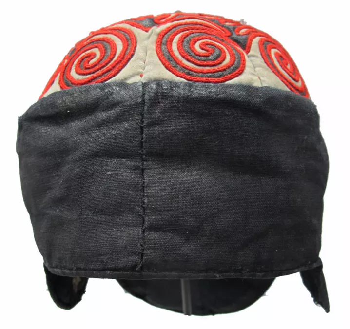 Red Miao Boy’s cap with black applique designs skillfully couched with red silk; calendared dark indigo cotton padded hat with ear and back wind flaps with handwoven cotton lining; from Jianhe County, Guizhou; c 1980s; 20” circumference