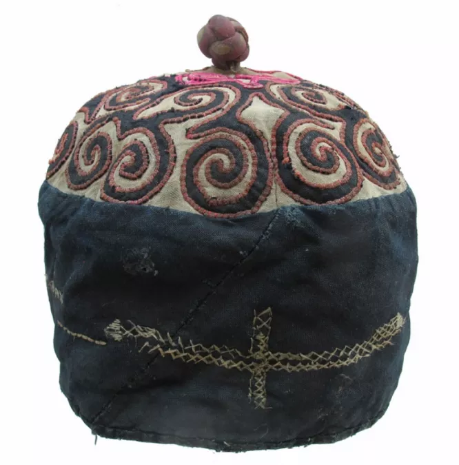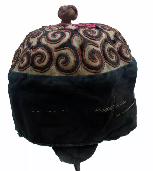 Red Miao Minority Boy’s cap with black applique designs skillfully couched with red silk and red cotton; dark indigo cotton hat with detachable ear flaps with handwoven cotton lining; classic red knot on top and simple cross-stitching designs on top; from Jianhe County, SE Guizhou Province; c 1980s; 21” circumference