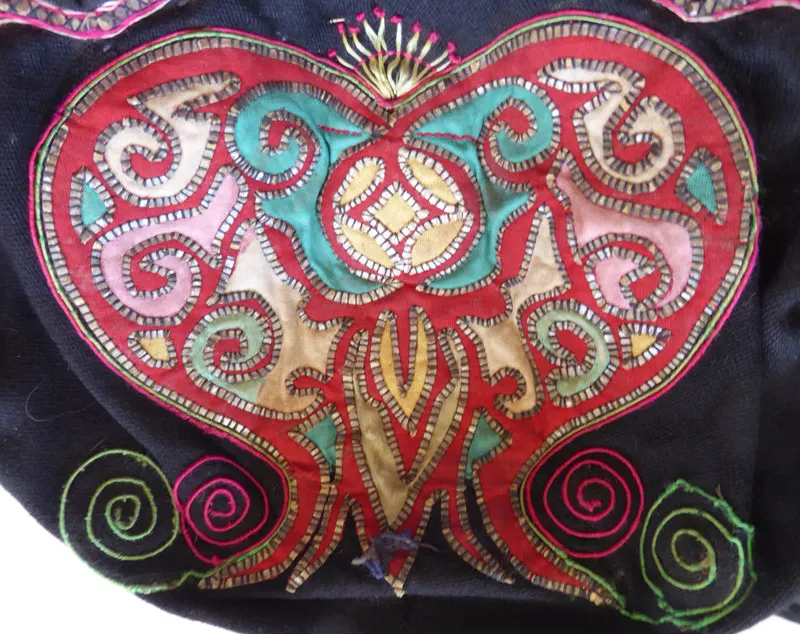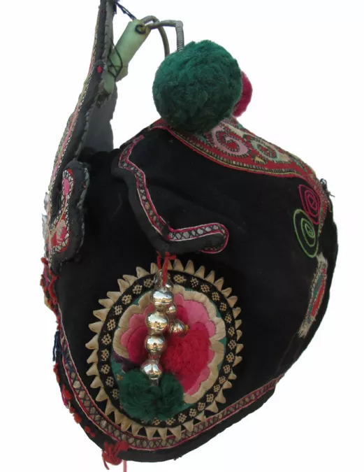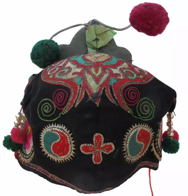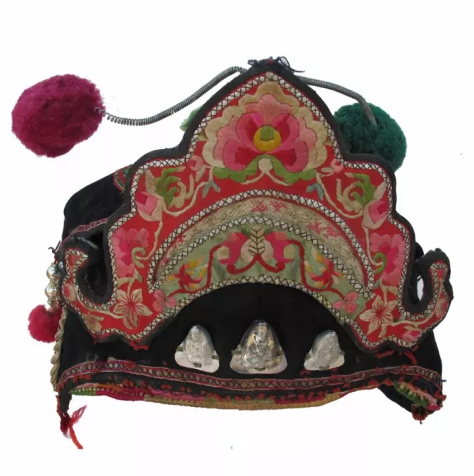 Bai Minority Girls Pomegranate Butterfly Hat; Classic symbolic hat from the Dali Area of Yunnan Province; Attached ru-yi (“may your wished come true”) shaped crown of red silk embroidered with flowers and a butterfly (happiness) and attached pompoms on hand-made springs (Jung Balls…the Hero’s Courage); two side attached circles with pink peony (wealth and worldly glory); Fine large appliqued composite image of butterfly and pomegranate with Chinese coin center on the back; three base metal Immortal figures on front; old glass beads on small pompoms; silver and gold foil couching on edges; red cotton lining with evidence of use; c 1960; collected by the late Peter Nelson in late 1980’s 20” circumference.