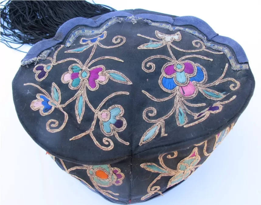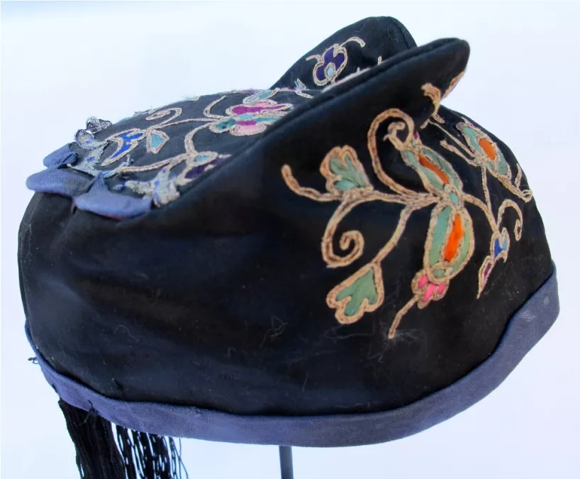 Unusual black silk hat with silver thread wrapped outlines of flowers filled with satin stitch embroidery; black silk fringe down the back (can be braided into queue; glazed red cotton lining; good condition with wear of silver threads; c 1910; northern China