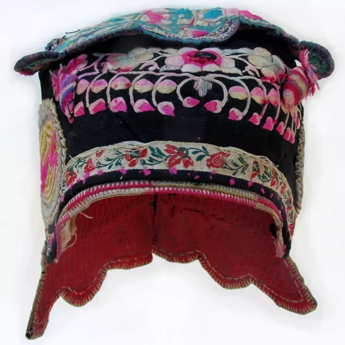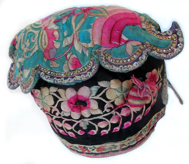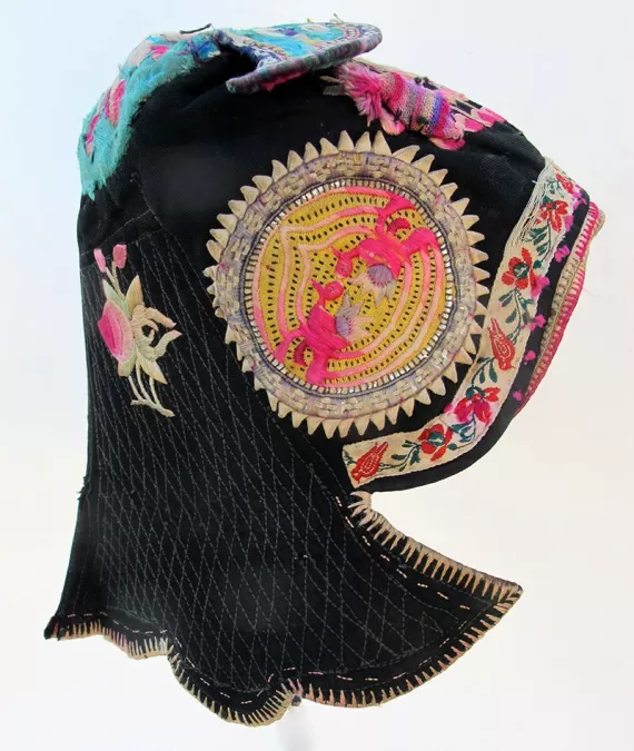 Bai Minority Flower Wind Hat with Berries; Black cotton embroidered with silk flowers and added applique circles; top is turquoise silk with needle-weaving trim and worn silk embroidery over paper cuts; longish scalloped back is machine quilted but trimmed with hand-stitching; sweet crocheted multi-colored berries are attached on the front…one has a seed pit inside; fair condition; c1960; Dali area, Yunnan Province