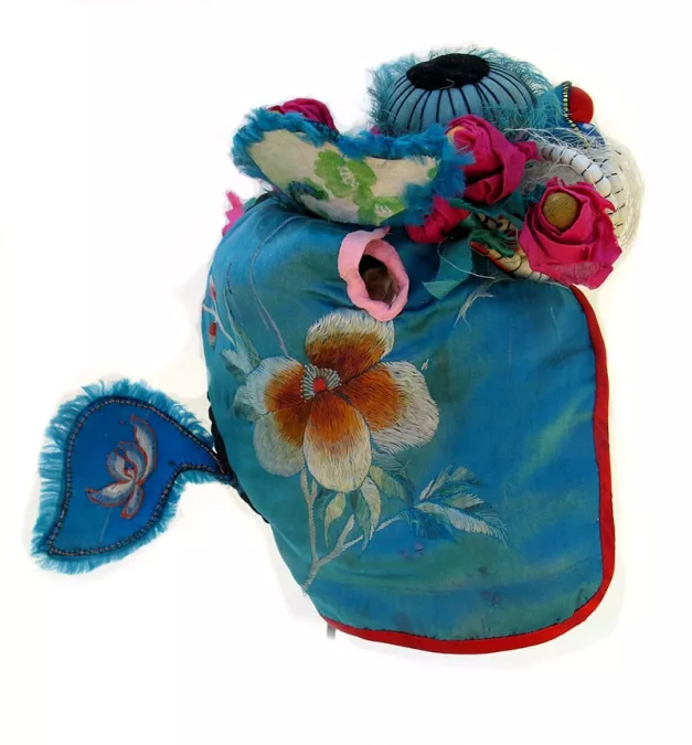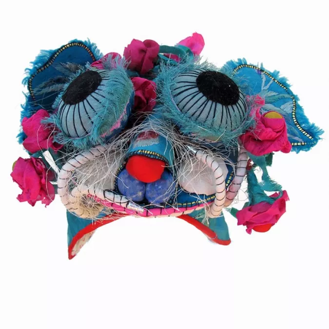 Lively Blue Silk Dragon with Flowers Hat; Large-eyed dragon face framed with pink flowers and embroidered with silk flowers; lined with old cotton print; c 1920s; good condition with nose repair; northern China; 16” circumference.