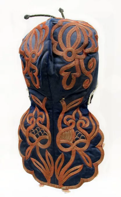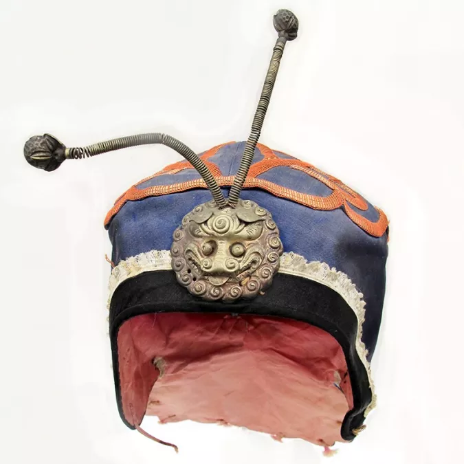 Golden Thread Protective Chinese Children’s Wind Hat; Well-made blue silk satin hat with bold composite designs created from golden metal threads couched evenly with orange silk thread; front features a protective circular tiger which has two tight springs with jingling bells; lined with polished cotton; fairly good condition; 19” circumference; c 1910