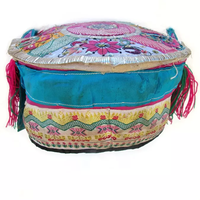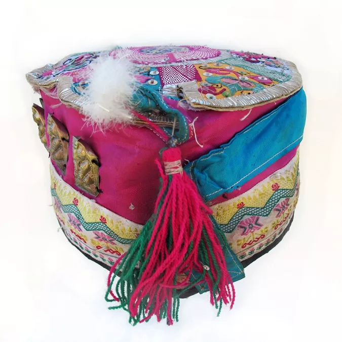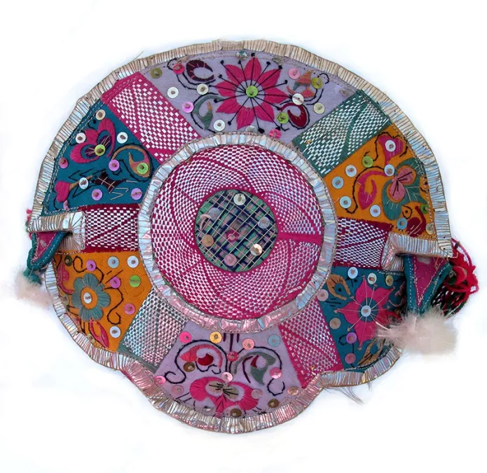 Dong Minority Girls Festival Hat; Pink silk satin hat with woven ribbons and six metal Buddhas; Elaborate top with silk embroidery, colored sequins, couched shiny silver paper and diving bands of needle weaving with silver metal strips; small clumps of chicken feather decorations; 20" circumference; likely from Sanjiang County of Guangxi Province; c 1970’s