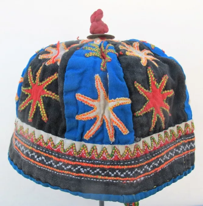 Sweet Flowery Hmong cap from northern Vietnam. Eight alternating black and white triangles with colorful appliqued stars; nicely detailed trim; white cotton lining; good condition; 18” circumference; late 20th Century