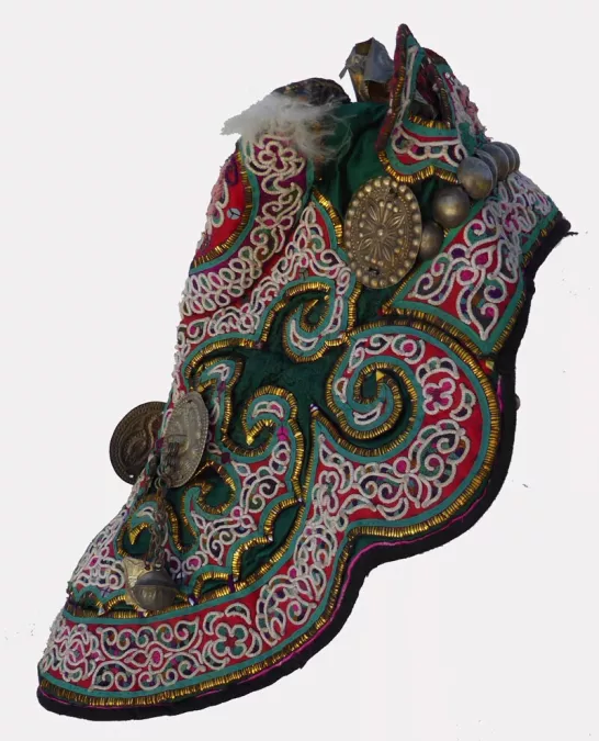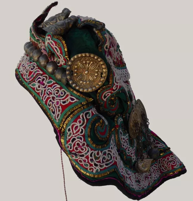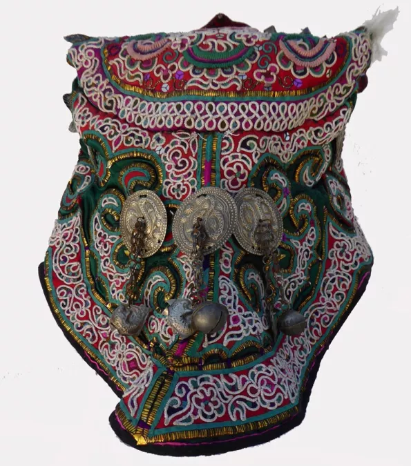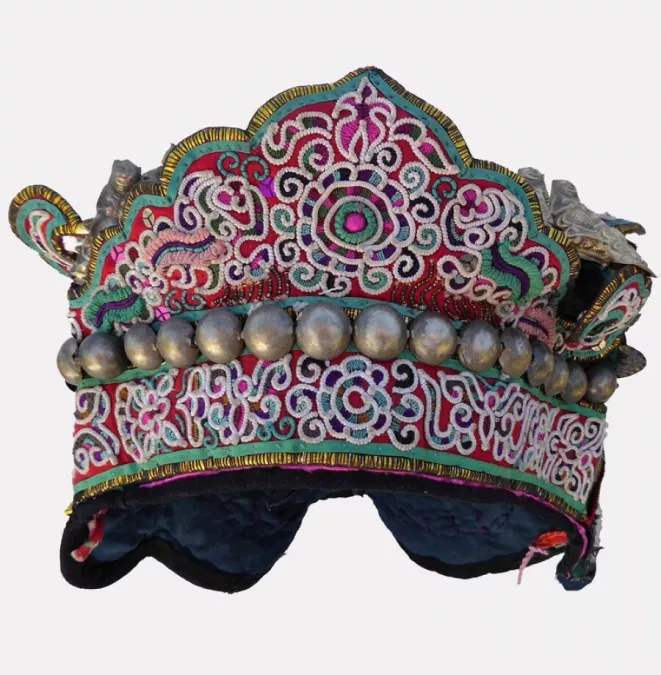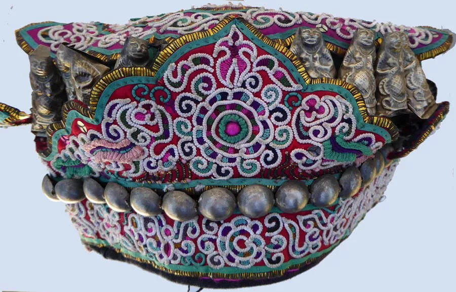 Elaborate Dong Embroidered Festival Hat; Skillfully embroidered appliqué sections with fine wrapped thread designs, hand-made silk braids creating elaborate 3-D dragon backs, gold foil couching, colored metal sequins; metal immortals and hemi-spheres on front and dangling medallions with bells on back; lined with handwoven indigo cotton; c 1960s; SE Guizhou Province; excellent condition; 24” circumference.