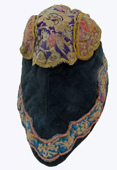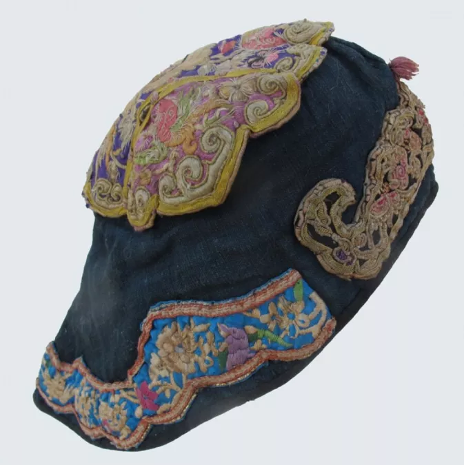 Chinese Minority Embroidered Wind Hat; Basic winter hat of padded indigo-dyed handwoven cotton with five appliquéd pieces attached. The silk embroidery on the appliqued pieces is in two styles used both by the Miao and Dong ethnic minorities living near each other in SE Guizhou Province; c 1960; fair condition as the embroidered pieces have had a lot of exposure and are faded; 22” circumference.