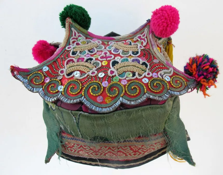 Sweet Dong Silk Embroidered Festival Hat; Skillfully embroidered appliqué sections with wrapped thread designs including a bullion stitched insect backs, silver and gold foil couching and silk braid trim, and colored sequins of red silk; base of printed silky material has woven ribbon on bottom; padded and lined with handwoven indigo cotton; c 1960s – 1970s; SE Guizhou Province; good condition with one missing pompom; 18” circumference