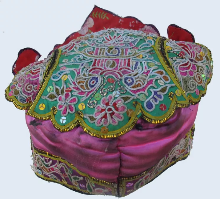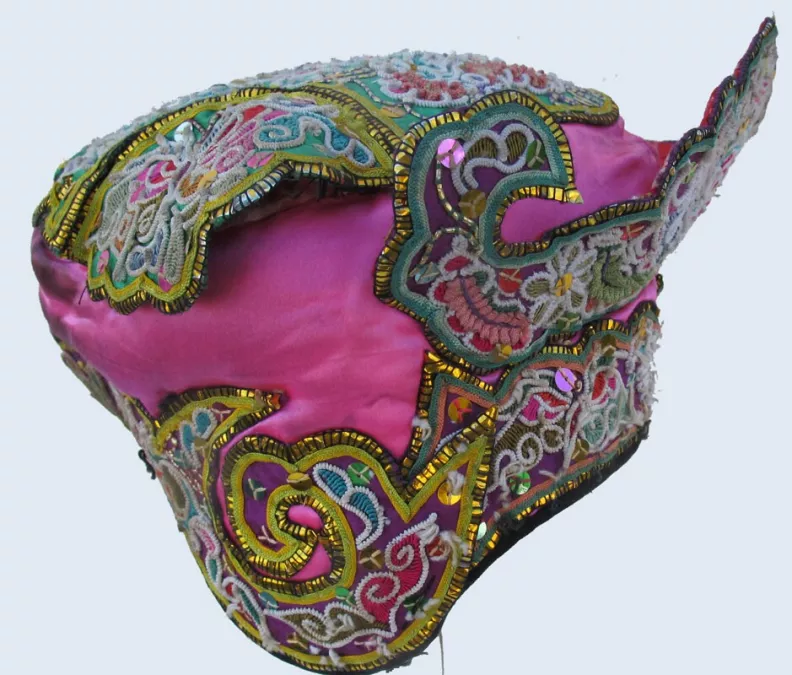 Pink Silk Dong Minority Festival Hat; Lively embroidered purple and green silk appliqué pieces featuring two dragons with a flower on the front and elaborate temple scene with butterflies and fish on the top… all outlined with twisted white silk gimp and filled a long tailed two-needle stiches; edged in gold foil and decorated with colored sequins; filed with padded print cotton; c 1975; good condition, except for dark smudging on the back; 20” circumference