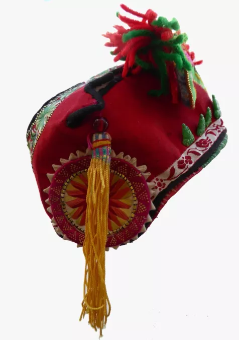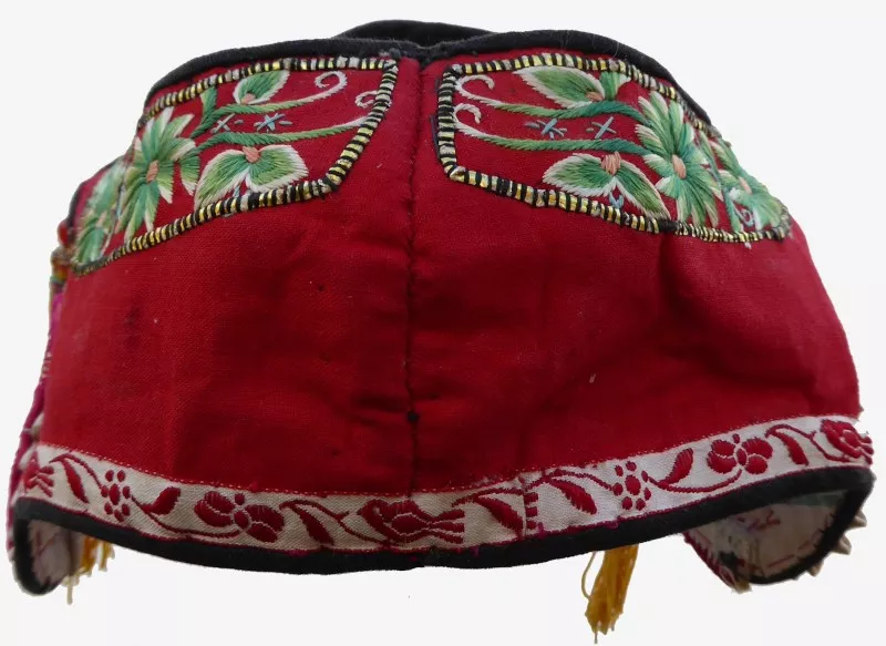 Lightly-used Bai Minority Embroidered Girls Hat. Clean red cotton hat with simplified crown embroidered with a transforming cranes and longevity Chinese character. Surrounding the open top are well-embroidered silk green and white flowers; on the sides are a circle with red and orange flowers trimmed with needle weaving; in the front above a commercial flower and bird ribbon are seven plastic green Buddhas. Additional top decorations of yarn and tassels with glass beads; purchased in Dali, Yunnan Province in July 1987; made c 1980; excellent condition; 20” circumference.
