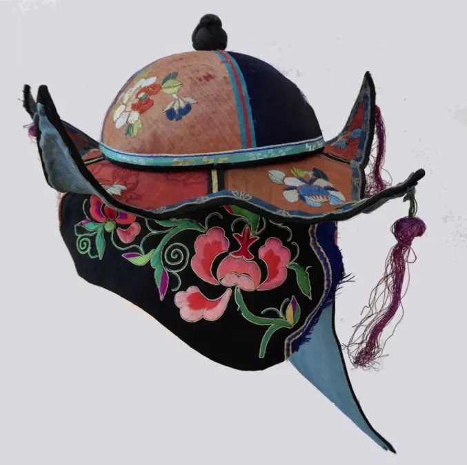 Large Chinese Scholars Pavilion Silk Hat; Made with fine Silk Embroidery; The Kuan or Champion of the civil examinations hat was given to young boys with the hopes of having academic success and an illustrative career; Hat given to young boys with the hopes of having academic success and an illustrative career; The black silk crown has very fine silk embroidered composite flowers, pomegranates, and butterflies outlined with fine gimped silk; back wind flap has unusual embroidered borders with more silk embroidered butterflies and flowers on gold foil; silk lining; excellent condition; late 19thc to early 20th century; likely Shanxi Province; 23” circumference