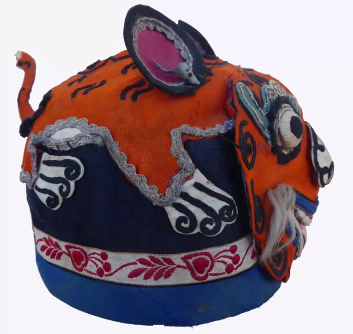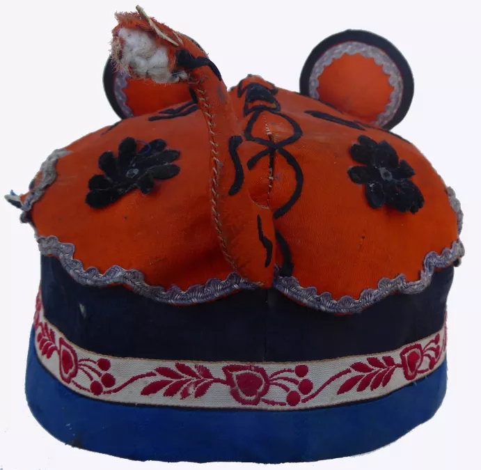 Friendly Orange Silk Tiger Hat with Mice in Ears; Sturdy Chinese Child’s Tiger Hat with an eager looking tiger like your favorite puppy, but hopefully fierce enough to scare away any evil spirits. Good facial features with thangs and natural whiskers; tongue is embroidered with a delicate flower; tiger strips of black silk braid; commercial red and white ribbon on bottom border; good lining; early 20th century; in general is in good condition; the very tip of the tail is damaged; Han Chinese; 18” circumferenc