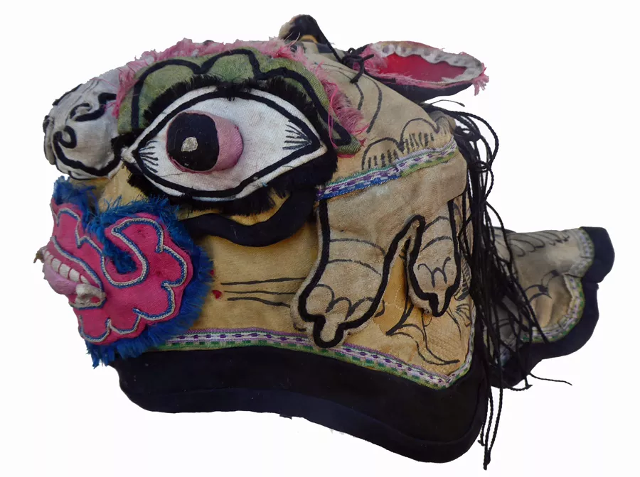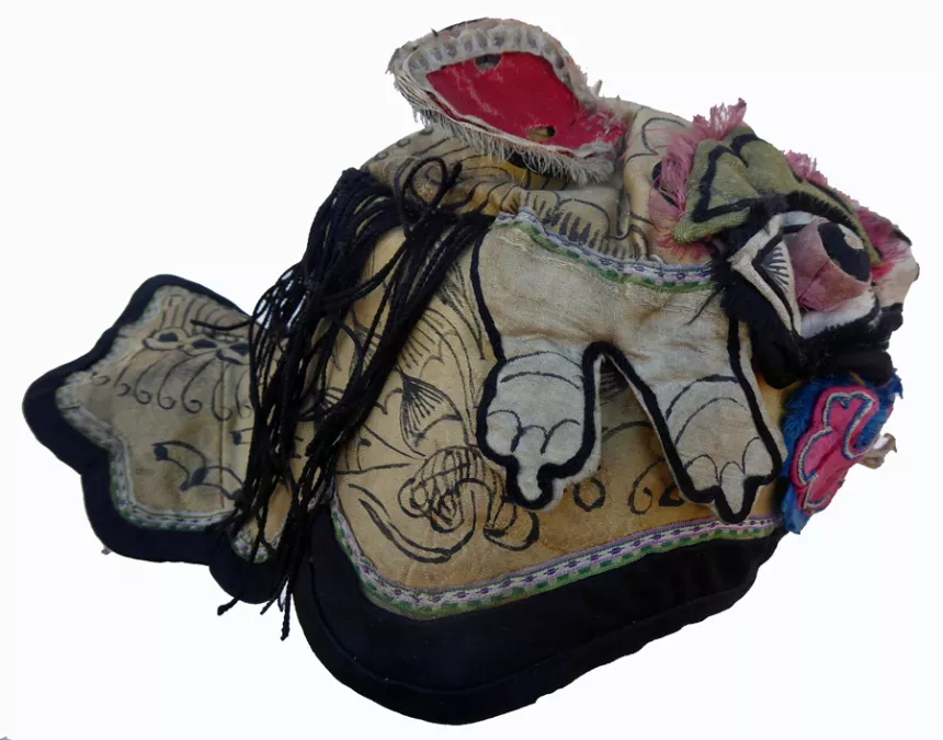 Yellow Silk Ink-Drawn Tiger Hat ready to scare away any evil spirits; Yellow statin body has some bleeding from the inked designs which includes a back bone with stripes but also peony flowers symbolizing weath and power; black silk fringe down the back; good facial features: the mouth is large, dramatic, and in good condition; orange brocade lining; fair to good condition; early 20th c; Han Chinese; 17” circumference;