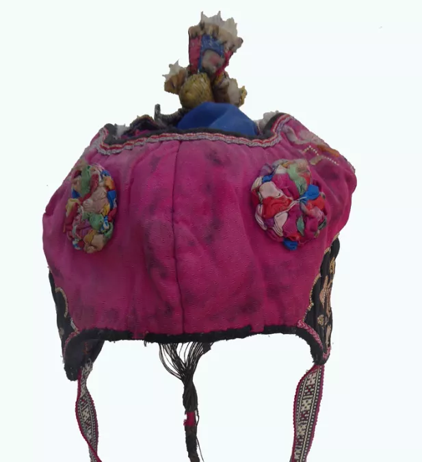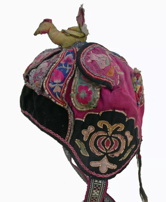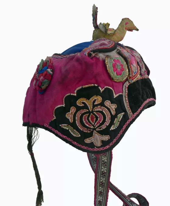Bai Minority Hat with Phoenix on silk embroidered Lotus Petals; Lots of good features on this well used child’s hat of pink satin and black velvet including fur trim, probably rabbit , on the phoenix (female virtues) tail; gold foil couching edging the lotus petals (purity) and reverse applique of pomegranate fruits (fertility); good braid embroidery details; handwoven ties; three-D floral attachments on back, and a small queue. Cotton lining; fairly good condition with soiling on the back pink satin; likely Dali area, Yunnan Province; c 1960; 20” circumference.