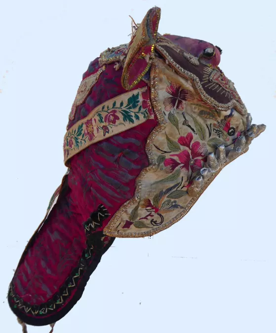 Bai Minority Tiger Wind hat with Immortals; An uncommon example of a traditional Bai Tiger Hat with expressive features outlined in couched gold and silver foil; front edge is lined with 17 base metal Buddhist Immortals; details include hand made non-metal sequins and small turquoise colored beads; the applicated bat on the back represents happiness for the child; the front white silk panel is soiled with use but full of colorfully embroidered birds, flowers, and insects; the long back is quilted red silk brocade which has significant wear with time and use; cotton lining is a dramatic cotton print pattern; 20” circumference; from Dali area of Yunnan Province; c 1940.