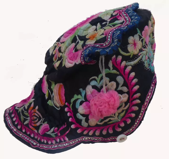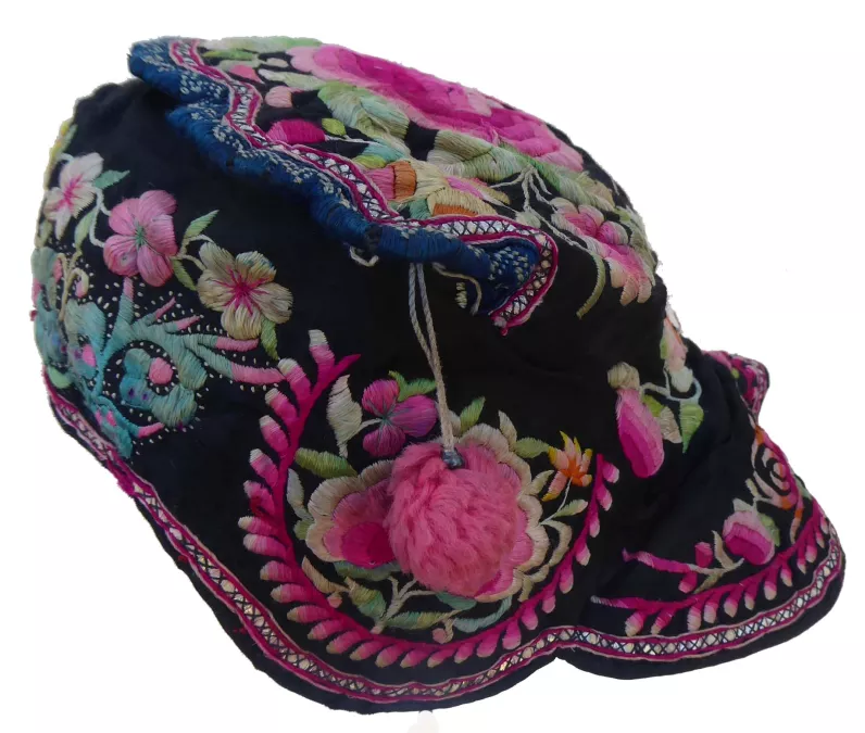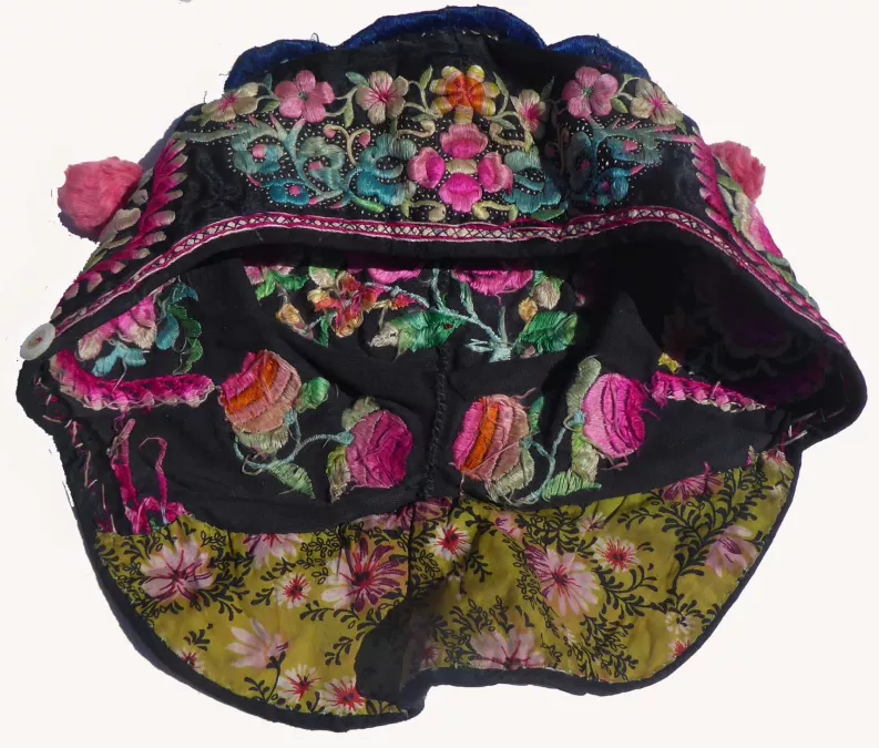 Sweet Bai Minority Silk Flower Wind Hat; Fine satin stitch silk embroidery over paper cuts made directly on black silk satin backed black cotton; Flowers include peonies for wealth and buddha hand’s as a wish for a prosperous and long life; additional fine touches include needle-woven borders, and couched paper foil edges plus 2 pompoms; bottom back is lined with a floral print; one pearl button; good condition but one damaged section of on the top peony; c1960; Dali area, Yunnan Province; 20” circumference.