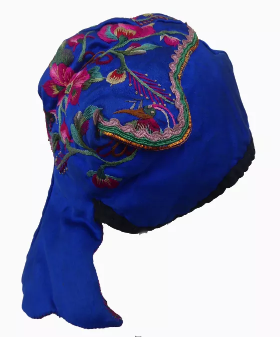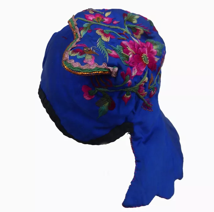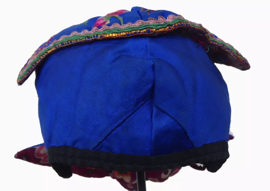 Miao Newborn’s Silk Flower Embroidered Wind Hat. Bright blue silk padded hat with lively embroidered peonies (for wealth) and other flowers as well as insects; butterflies (happiness) on the ears; topped edged with gold foil and small braids; lined with printed cotton; all hand-stitched; excellent condition; worn especially in the winter by children of the Miao Minority in Shidong area of Taijiang County, Guizhou Province, China; c 1970s; 15” circumference.