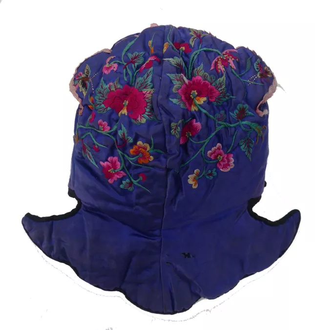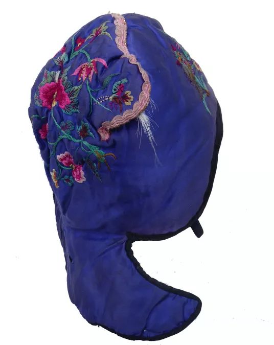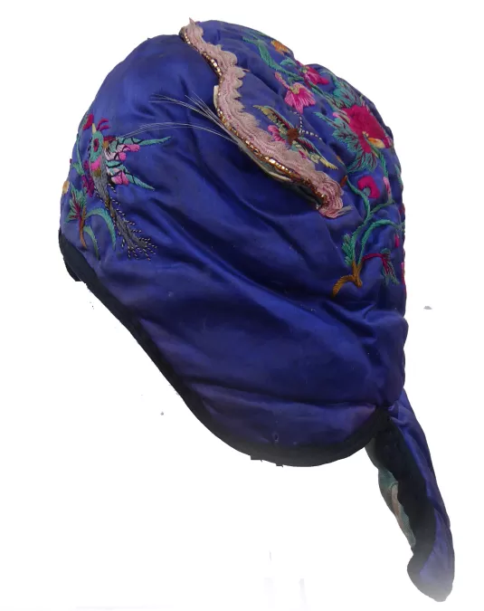 Bird and Peony Blue Silk Miao Padded Wind Hat; Silk embroidered peonies (for wealth and worldly glory) and an owls and other birds decorate the front and back; butterflies (happiness) are on the ears ; lining is half cotton floral and half stripes which show more soiling; two holes on the back flap; c 1970; from Shidong area, Taijiang County, Guizhou; circumference 20”.