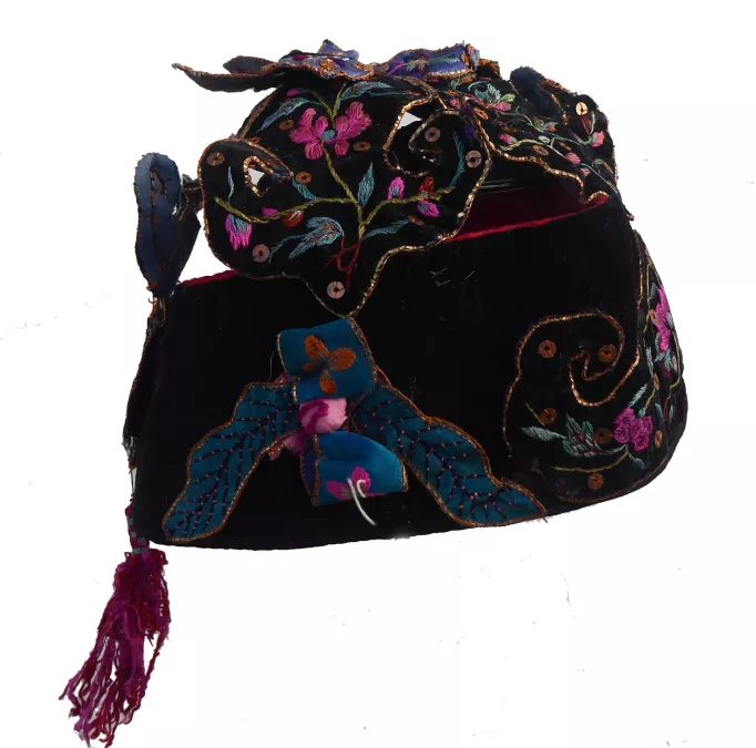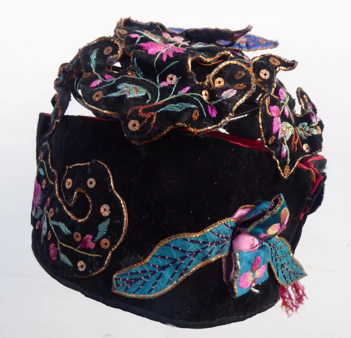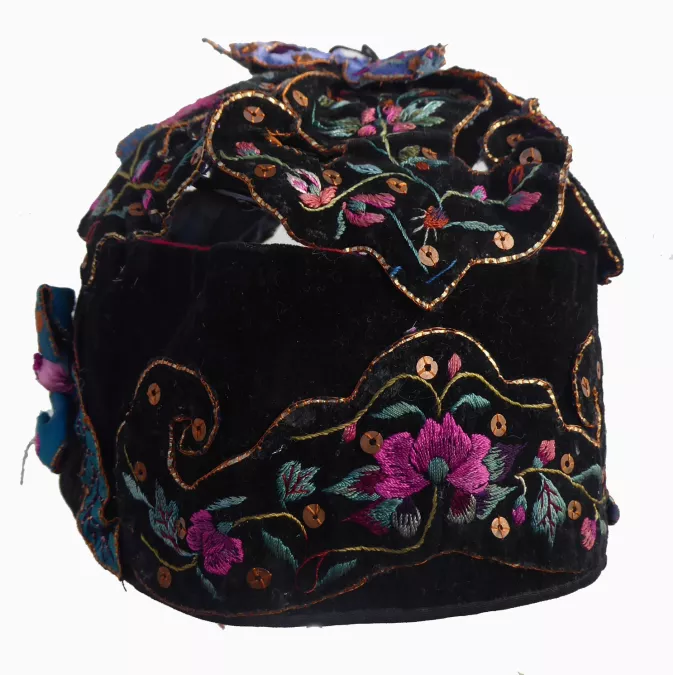 Miao Minority Girl’s Black Velvet “as you like it” hat. Wide band is topped by top blue silk applique of insects on a crown of five silk floral embroidered ruyi or “as you like it” pieces sewn together at the top; sections are couched with gold threads; 3-D appliqued decorations with flowers are on both sides; handmade copper sequins are added; lined with blue and red cotton; c 1970; from Taijiang County , Guizhou Province; circumference 21”